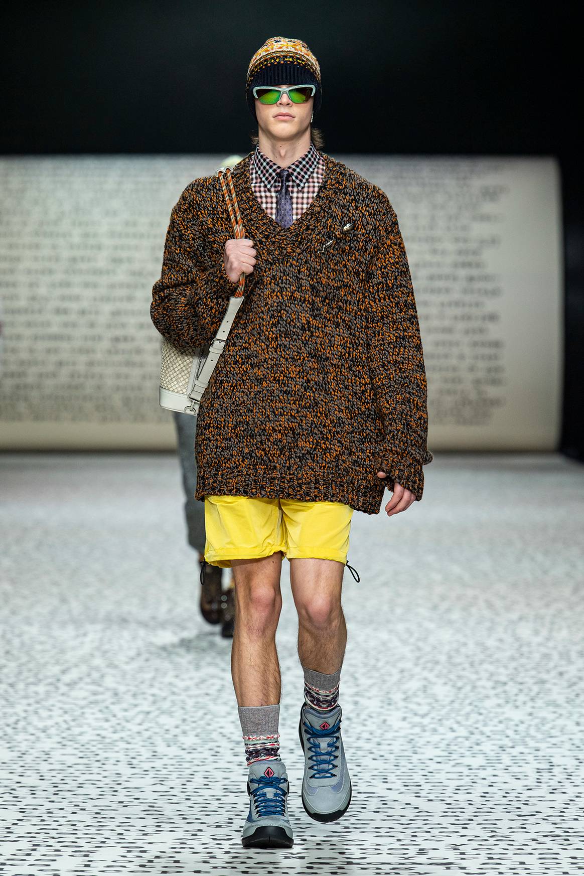 Profundizando ya en el fondo de la colección y de las piezas, la propuesta se presenta como una fusión de tradición y modernidad, de contracultura y tradición, y de herencia y modernidad, combinando las esencias propias de la cultura americana y el singular gusto por lo artesanal del savoir-faire de la casa parisina. Características que terminaban tomando forma en una serie de prendas, inspiradas a su vez en las colecciones de mediados del siglo XX confeccionadas por Yves Saint Laurent y Marc Bohan para la casa, de entre las que sobresalen los abrigos y chaquetas de tweed a cuadros, o unas distintas piezas de punto en “fair isle” con presencia de bordados con lentejuelas. Mientras que, como elementos que denotan esa combinación entre tradición y modernidad, nos encontraremos con sedas técnicas y tejidos de nilón reciclados, combinados con bordados y con la presencia de denim. Fibra americana por excelencia, de la que se cree que procede de Francia, con sus orígenes arraigados en la conocida como “serge de Nîmes”, que se muestra así pues en esta colección como un nuevo nexo de unión entre la casa francesa y su fundador, y el estadounidense Jack Kerouac y su producción literaria.